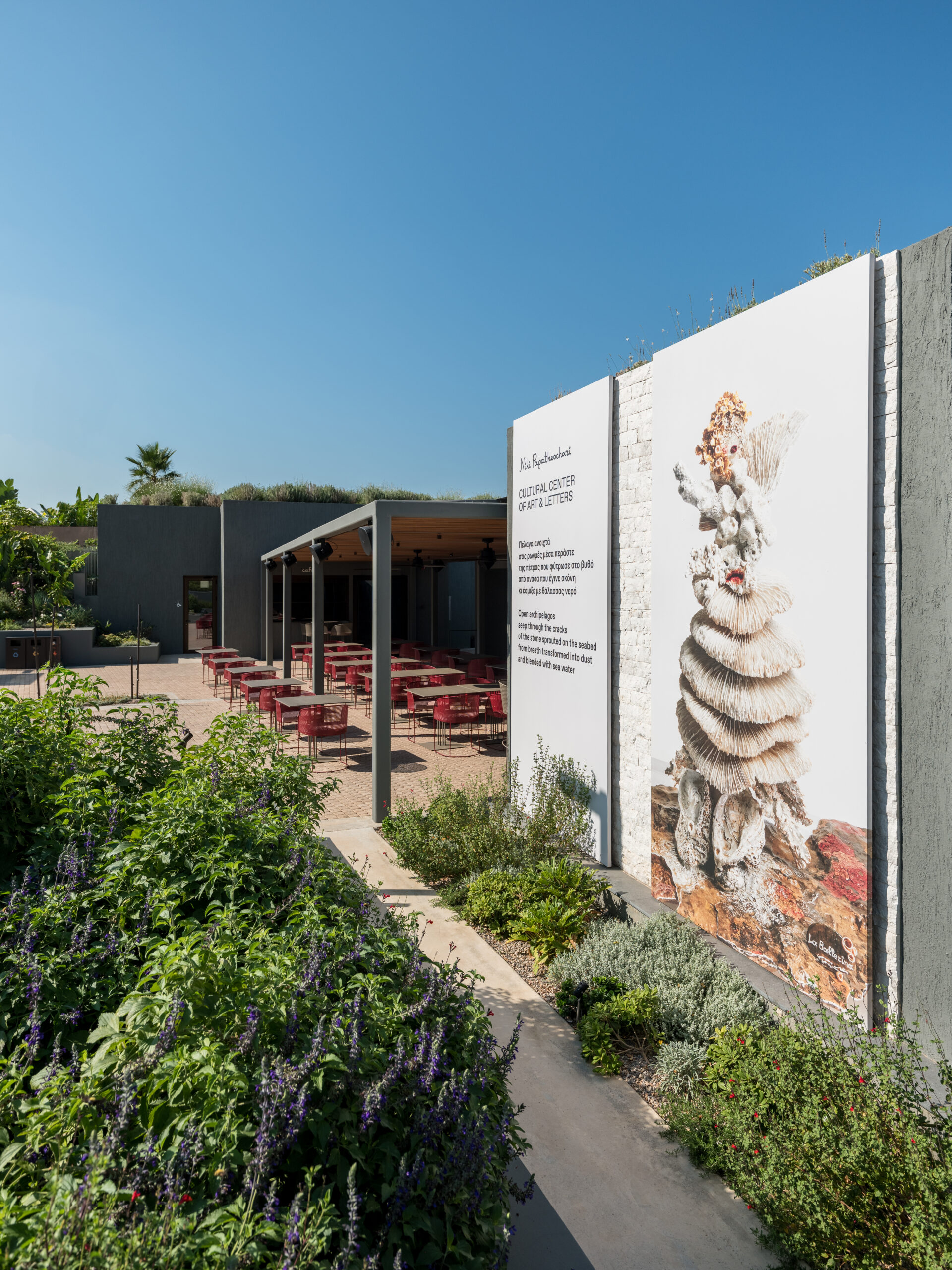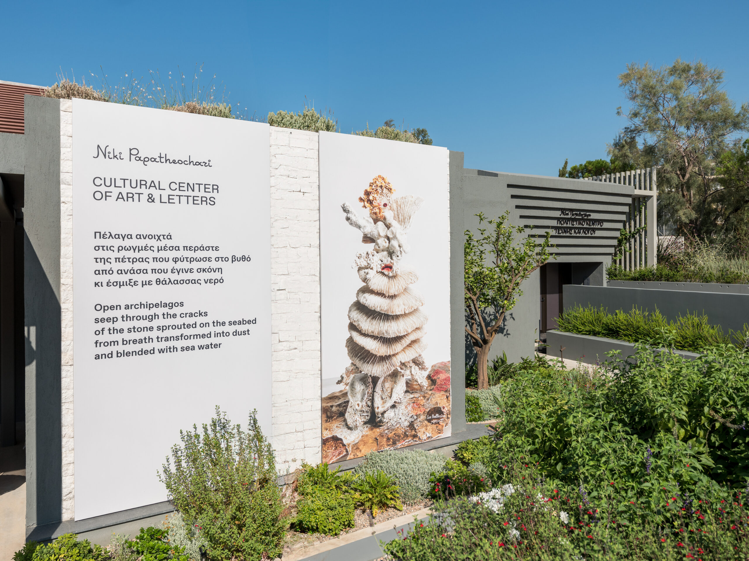Λίγα μόλις μέτρα από τη θάλασσα, οι επισκέπτες έρχονται σε επαφή με ένα μοντέρνο αρχιτεκτονικό τοπίο εμπνευσμένο από βότανα και λουλούδια της ελληνικής υπαίθρου, με διακριτικά τροπικά στοιχεία, που ενσωματώνουν αρμονικά το Κέντρο στην αισθητική των Αστεριών. Η γειτνίαση με την θάλασσα ενδυναμώνει συνειρμικά την εμπειρία του επισκέπτη με το περιεχόμενο του εκθεσιακού χώρου και το υγρό στοιχείο.