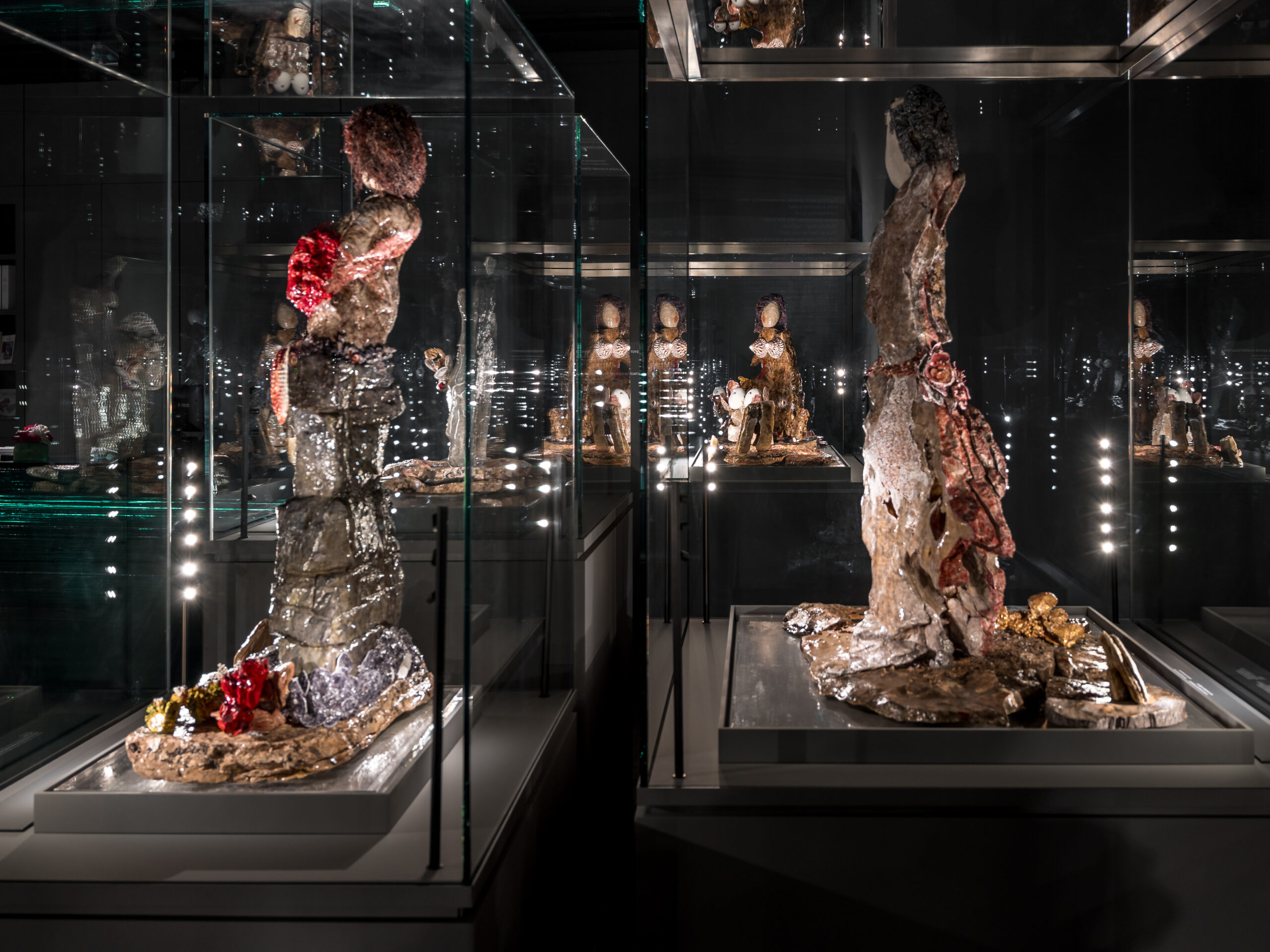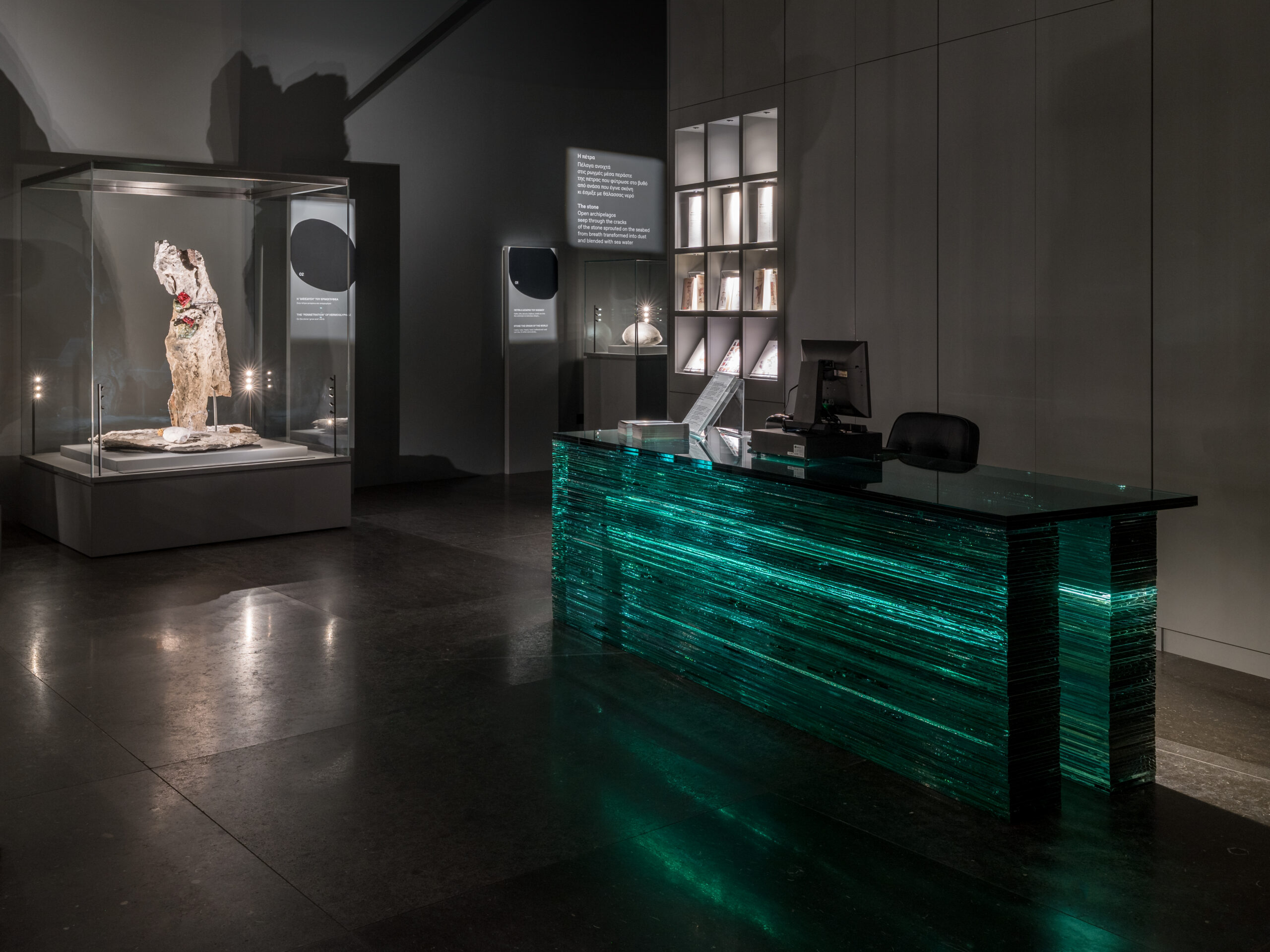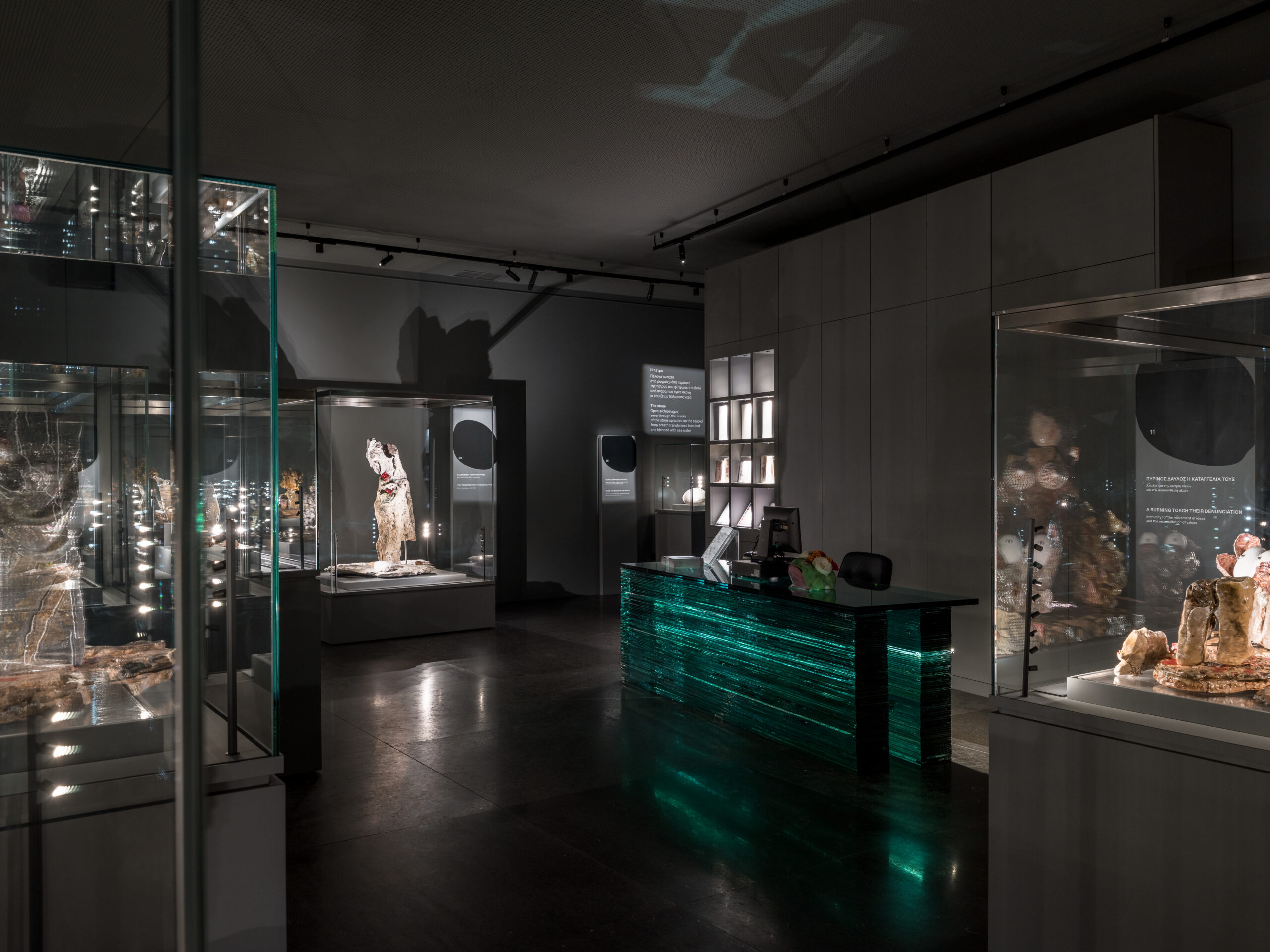 Η γυάλινη υποδοχή, έργο του γλύπτη Κώστα Βαρώτσου, συνδιαλέγεται δυναμικά με τα έργα, ενισχύοντας την έκπληξη του επισκέπτη