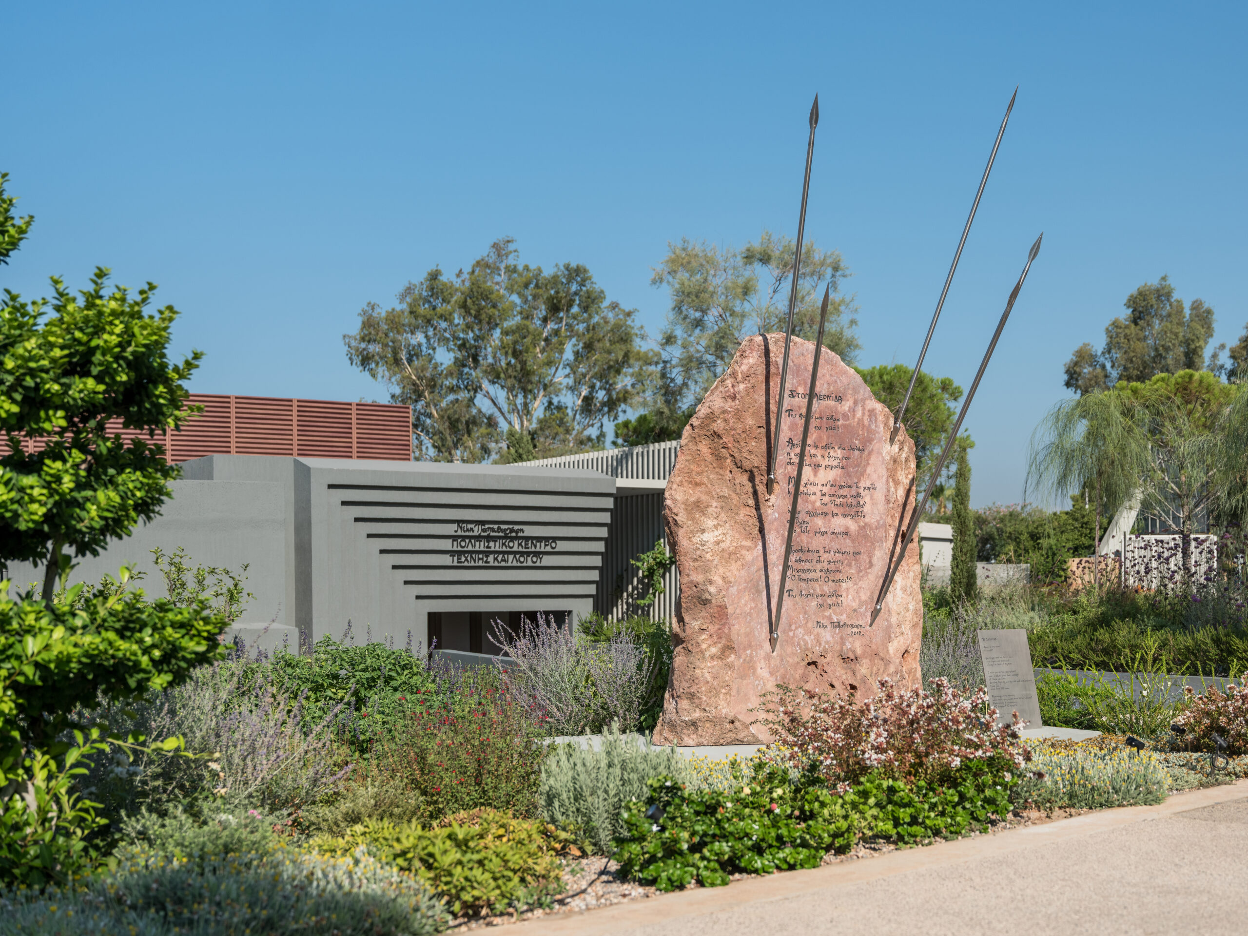Ως καλωσόρισμα στον εξωτερικό χώρο βρίσκεται ένα τάμα στον Λεωνίδα, παγκόσμιο αρχέτυπο σύμβολο, με μια πέτρα-μυθική υπεροχή.
